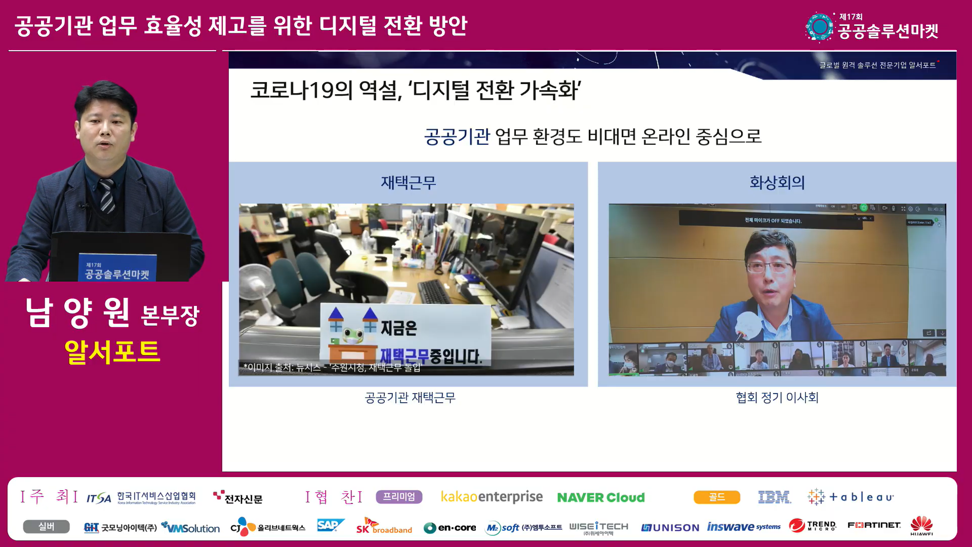 알서포트의 남양원 글로벌마케팅본부장은 이날 행사에서 “공공기관 업무 효율성 제고를 위한 디지털 전환 방안”이라는 주제로, 공공기관 업무 환경의 디지털 전환과 비대면 공공•대민 서비스를 위한 원격 솔루션을 소개했습니다.