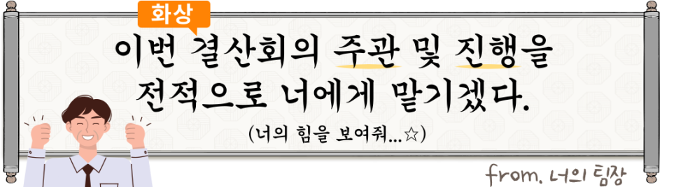 팀장: 이번 달 결산회의, 대신 운영 좀 부탁할게~ 미리 참가자 리스트랑 발표자료 공유할 테니까 다 참석했나 잘 확인하고~ PPT 자료나 영상 제때 잘 띄워주고~