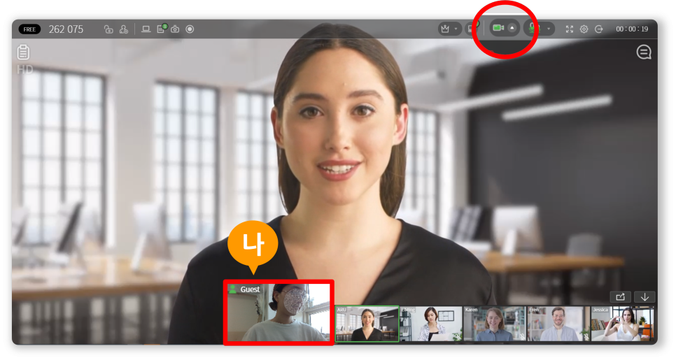 먼저 카메라에 비친 내 모습을 확인하고 앵글과 배경은 괜찮은지 가볍게 확인해보죠. 배경이 지저분해서 마음에 안 든다면 가상 배경을 한번 적용해 보세요. 원하는 이미지를 업로드하여 배경으로 바꿀 수도 있습니다 :) 카메라 아이콘을 클릭하면 내 카메라가 꺼지는 것을 확인할 수 있으니 내 모습을 보여줄 필요가 없다면 실제 회의에서는 카메라를 끄셔도 될 것 같아요.