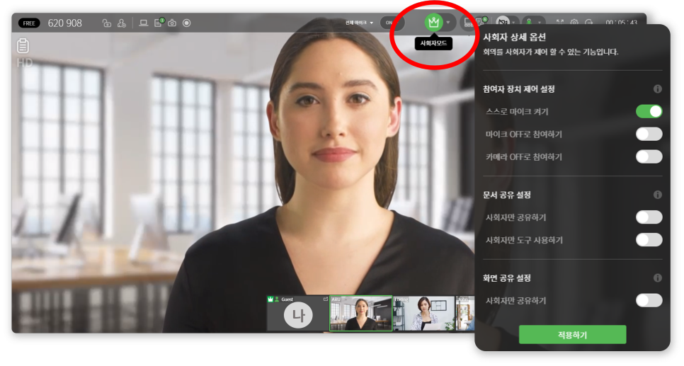 사회자 모드를 켜면 참여자들의 마이크/카메라를 제어하거나 문서 및 화면 공유 권한을 제한하는 등의 설정이 가능해집니다. 한참 발표 진행 중인데 발표자 외 다른 누군가 부적절한 화면(자료)을 띄워버렸다!!! (이런 민폐…😱) 이런 상황을 미리 방지할 수 있죠! 어떤 기능이 있는지 살펴보고 진행자(사회자)로서 필요한 조치를 할 수 있게 준비하세요.