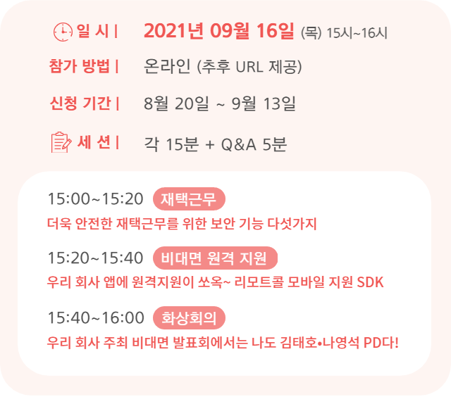 변화된 업무 환경에서 더 효율적으로 스마트하게 일하는 방법이 고민이시라면, 글로벌 비대면 원격 솔루션 전문 기업 알서포트가 준비한 9월 무료 웨비나에서 스마트한 비대면 업무 환경 활용팁을 확인하시기 바랍니다!