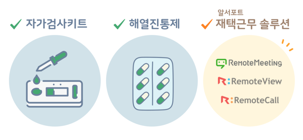 엔데믹 전환을 대비한 기업의 비즈니스 상비약은 첫째. 코로나19 자가검사키트 둘째. 해열진통제 및 종합감기약 그리고 셋째. 재택근무의 든든한 지원군! 알서포트의 재택/원격근무 솔루션 입니다.