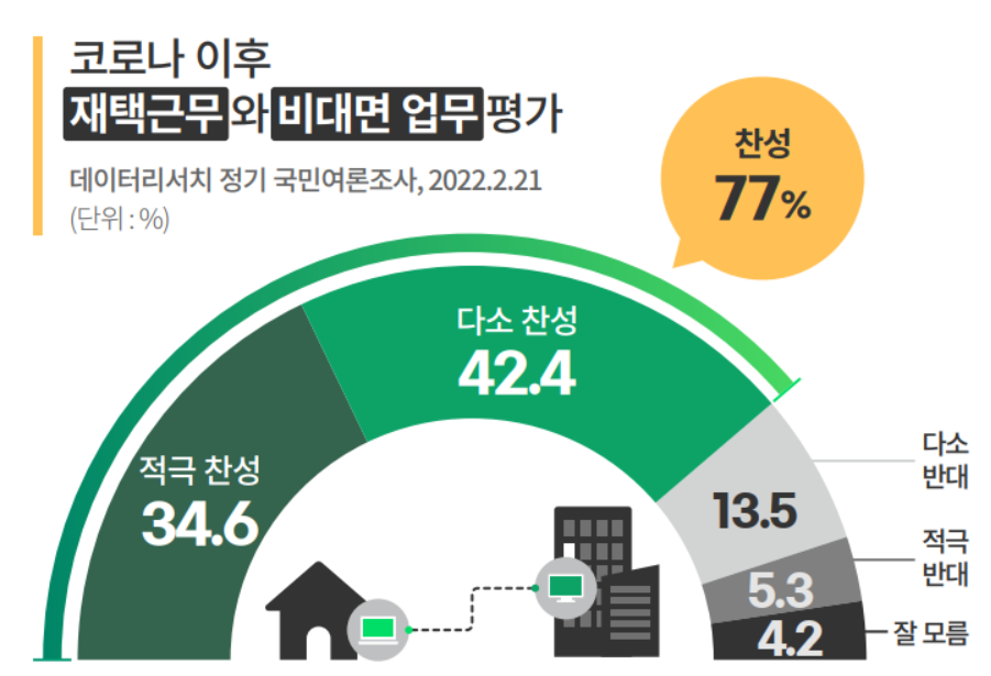하지만 국내 여론조사 전문기관 데이터 리서치가 전국 성인 1,000명을 대상으로 '코로나 이후 재택근무와 비대면 업무에 대한 평가'에서 77%가 찬성하는 것을 봤을 때 사무실로 직원을 부르려는 회사와 출근을 원하지 않는 직장인의 동상이몽은 계속되는 모습입니다.