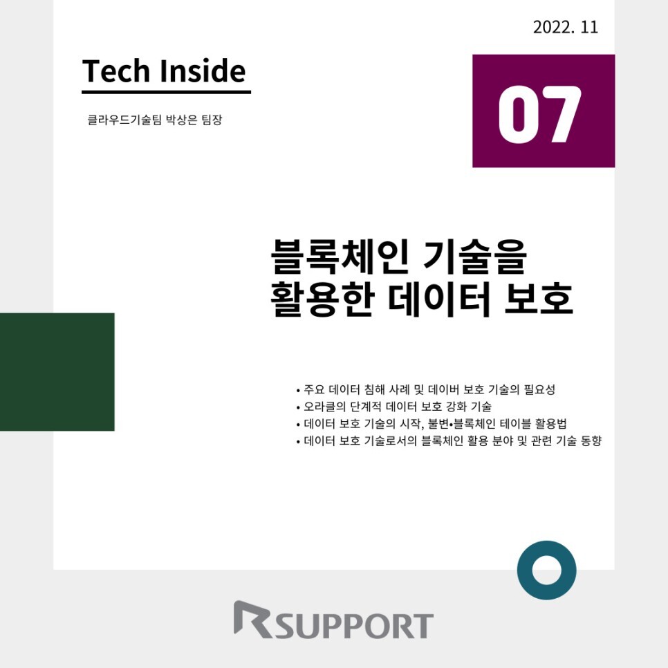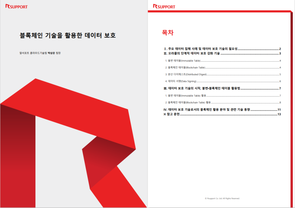 오라클은 블록체인 기술을 쉽게 도입할 수 있게 해준다. 특히, 데이터 보호 기술의 시작이라 할 수 이는 불변•블록체인 테이블을 실무에서 활용하는 상세한 방법은 알서포트 홈페이지에서 확인할 수 있다. 한편, 오라클의 단계적 데이터 보호 강화 기술 중 데이터 서명(Data Signing)을 할 때만 어플리케이션에서의 약간의 변경이 필요할 뿐, 그 외는 어플리케이션을 사용하면서 아무것도 변경하지 않고 적용이 가능하다는 큰 장점이 있다. 이로 인해 절대로 변경되어서는 안되는 데이터, 위•변조되었을 때 법적 책임이 따르는 데이터들을 핸들링할 때 별도의 블록체인 인프라를 구축하지 않고도 오라클에서 제공하는 블록체인 테이블 활용을 통해 소기의 목적을 달성할 수 있다. 데이터 보안을 절대시하는 모든 산업과 어플리케이션에서 쉽게 블록체인을 채택하고 활용할 수 있는 것이다.