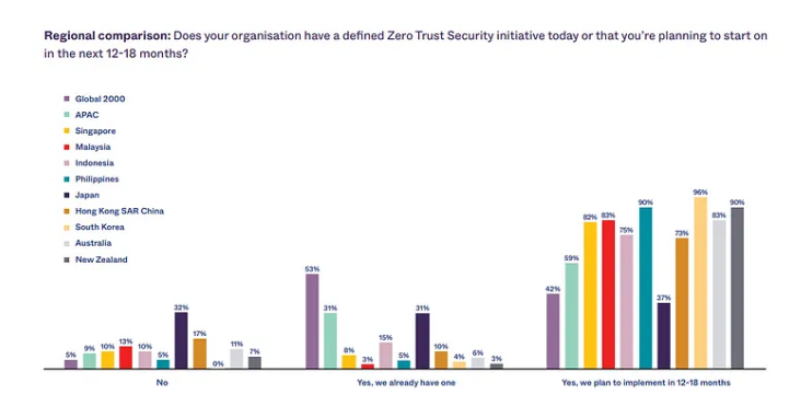 아시아 태평양 지역에서도 제로 트러스트의 채택은 초기 단계일 수 있지만, 조사 결과 다수의 조직이 미래에 제로 트러스트 조치를 통합할 계획임을 보여주었습니다. 이러한 성장하는 인식은 제로 트러스트가 비즈니스를 보호하는 데 어떤 핵심적인 역할을 하는지를 강조합니다.
