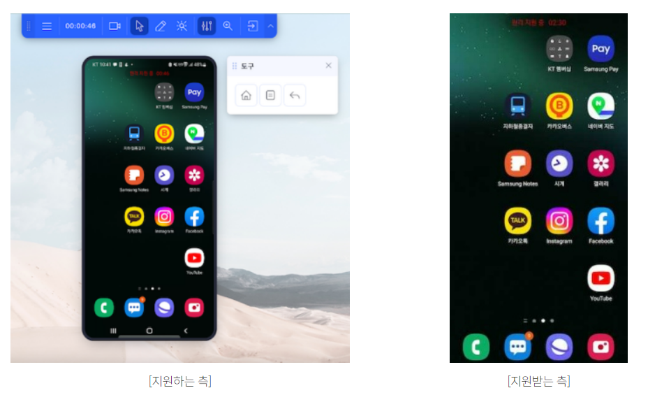 오른쪽 툴바로 지원받는 상대방의 홈 화면 기능을 제어할 수 있어요.