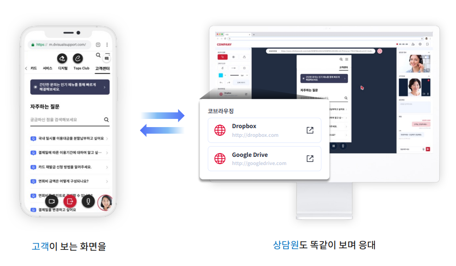 코브라우징 방식: 상담원과 고객이 동일한 화면을 보며 실시간 응대 가능