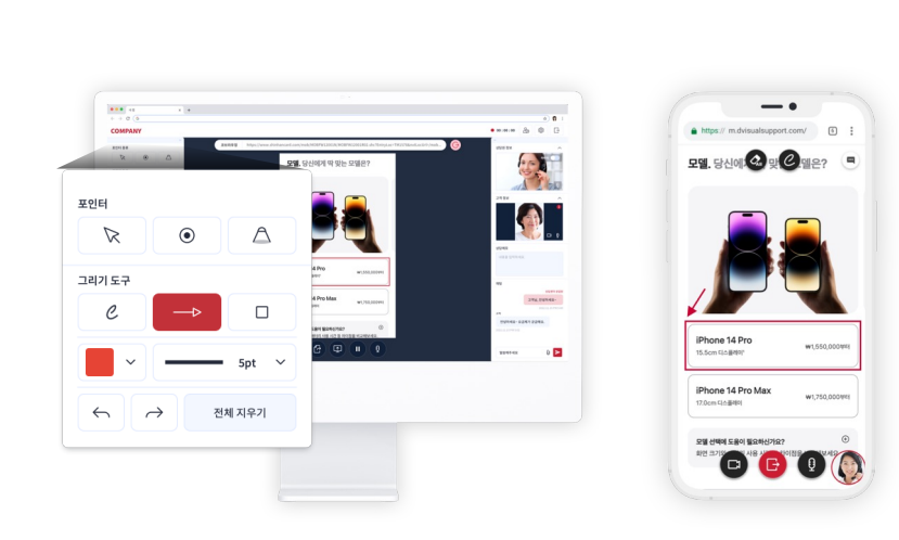 화면/문서공유, 코브라우징 도중 포인터와 그리기 도구를 활용, 고객에게 자세한 설명이 가능합니다.