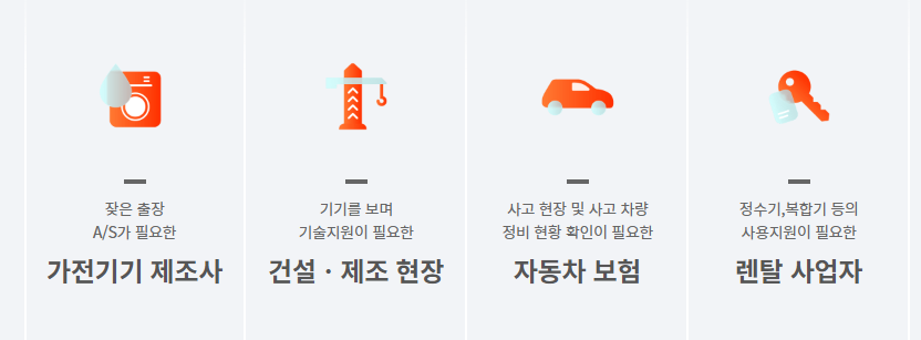 현장에 가지 않고도 같이 있는 것처럼 눈으로 볼 수 있기 때문에 어떤 산업 분야든 장소와 대상의 제한 없이 지원이 가능합니다.
