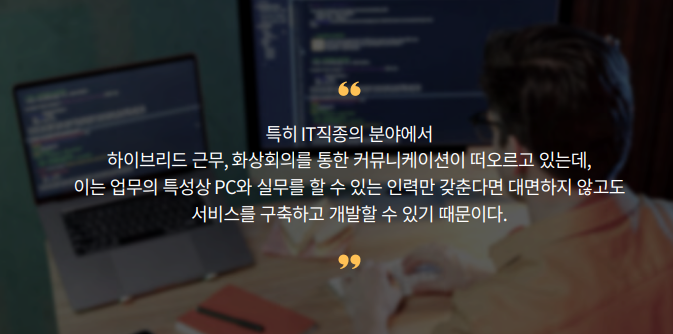 주목할 분야는 바로 IT입니다. IT는 가장 먼저 앞장서 하이브리드 근무 형태를 선택해 제공하고 있는데요. 이는 인재 유치와 하이브리드 근무 형태도 충분히 생산성을 보장할 수 있다는 자신감(그 자신감은 이미 대다수의 IT 분야는 원격 근무를 할 수 있는 시스템이 확보된 상태)으로 인한 것으로 보입니다.