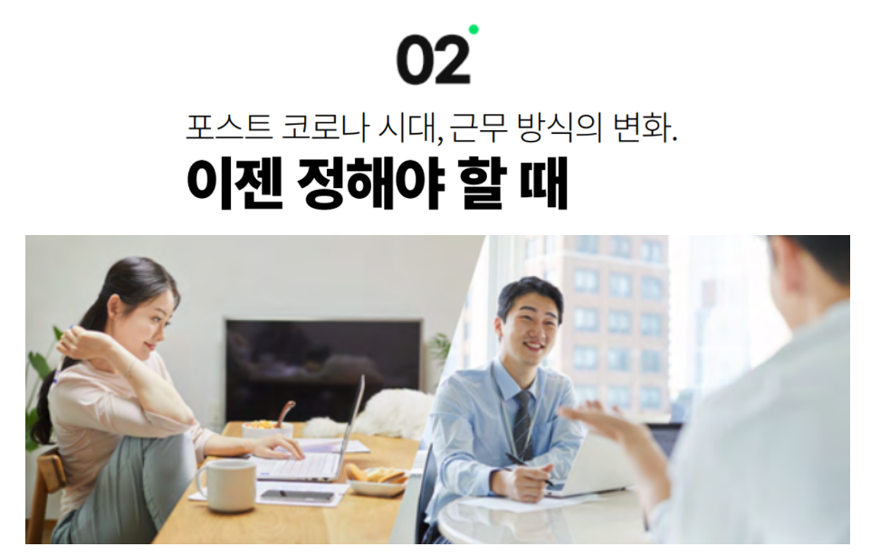 코로나19의 경험을 바탕으로 기업들이 내놓는 근무 형태는 다양합니다. 원격근무, 하이브리드 워크, 유연 근무, 전통적인 방식인 사무실 출근 등 어떤 방식을 택하던 공간과 시간의 제약이 없는 상태에서 개개인이 원하는 최적의 장소에서 업무에 집중할 수 있는 환경을 선택할 수 있도록 기업들은 다각도로 고심하고 있습니다.