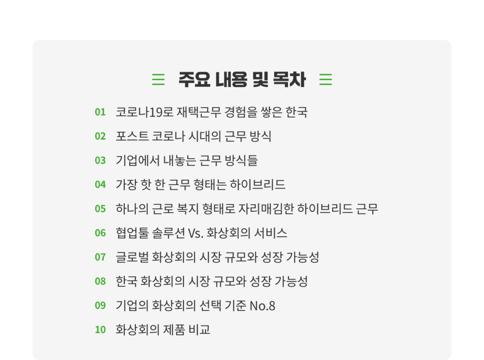 초창기 중구난방 그 자체였던 화상회의 운영 정책은 현재에 와서는 '화상회의의 일상화'라 불릴 만큼 대부분의 사용자는 화상회의 관련 프로그램, 앱, 장비 등에 익숙해졌고 기업에서는 회의, 원내 교육, 세미나, 면접 등 다양한 분야에서 활용 등 일상에서 화상회의를 제하고는 말할 수 없는 단계까지 왔습니다.