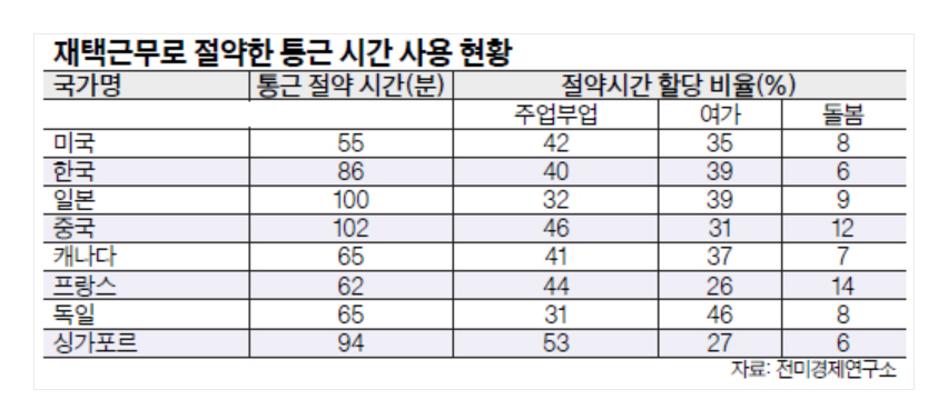 재택근무 덕에 출퇴근 준비 및 이동 시간을 아끼게 됐고, 이는 곧 개인 시간이 늘어나는 것으로 이어졌죠. 전미경제연구소(NBER)의 ‘재택근무 시의 시간 절약’ 보고서에 따르면 한국 재택근무자들이 출·퇴근을 하지 않아 절약한 시간은 하루 평균 86분이었습니다.