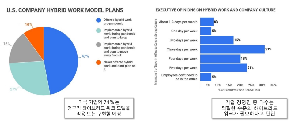 미국 기업의 74%가 영구적 하이브리드 워크 모델을 사용 중이거나 구현할 계획이라는 조사 자료가 있습니다. 잡코리아가 지난해 직장인 398명을 대상으로 희망 근무 형태를 조사한 결과 '하이브리드형 근무'가 1위(67.3%)로 나오기도 했습니다. 해당 응답자들이 선호하는 출근 일수는 주3일(47.4%), 주2일(25.7%)이 많았습니다.(Link)