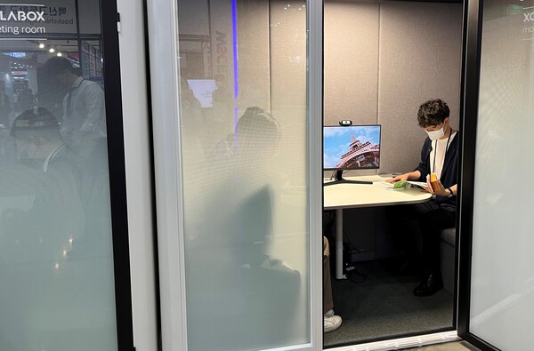 관람객들의 시선이 집중된 콜라박스는 알서포트가 국내 최초로 개발한 설치형 올인원 화상회의 부스로, 사무실 등의 자투리 공간에 간편하게 조립해 사용할 수 있다.