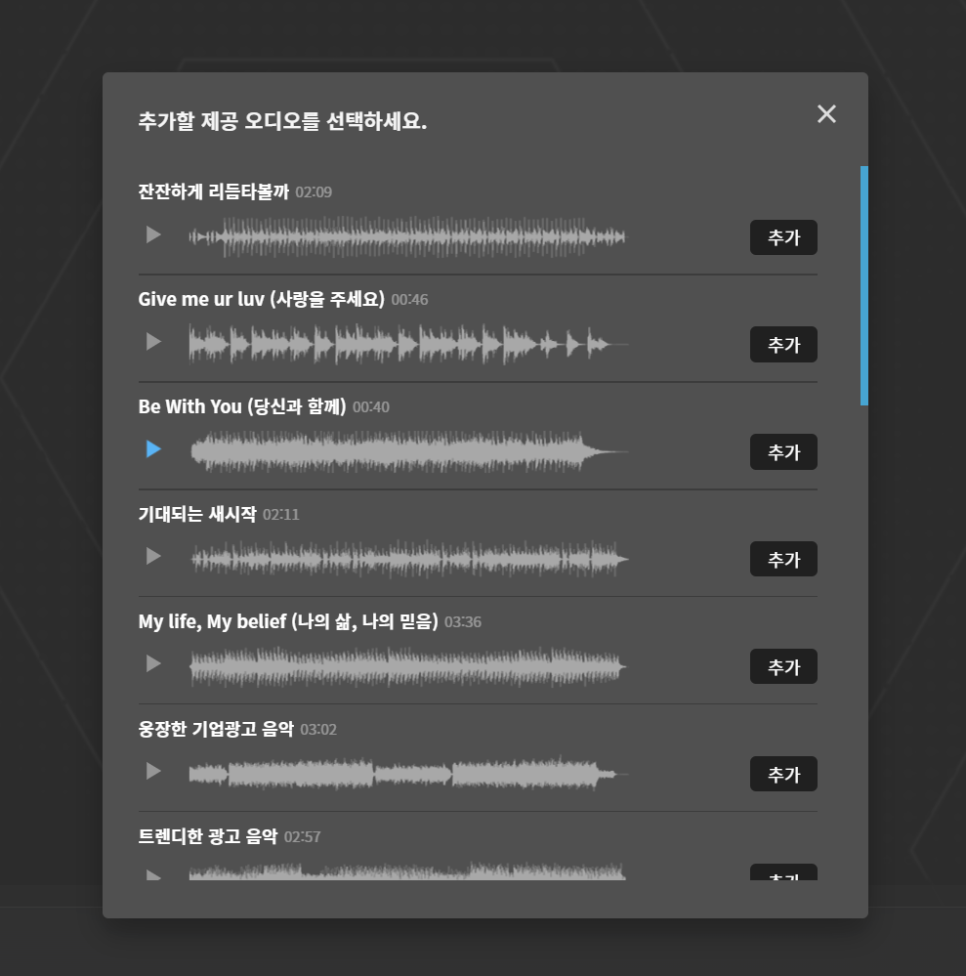 사용하실 음악의 ‘추가’ 버튼을 눌러주세요!