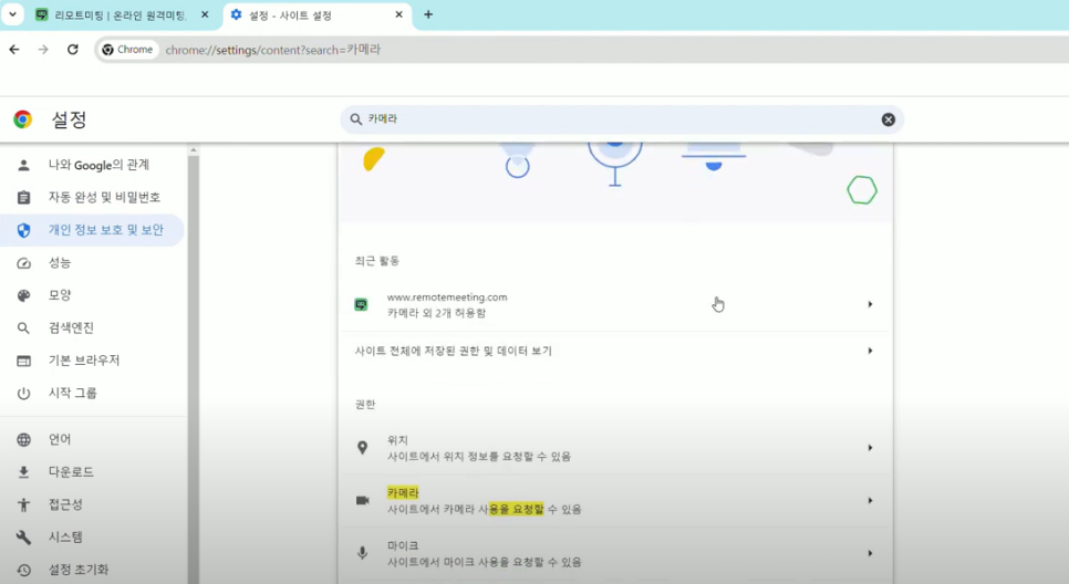 [설정]-[개인 정보 및 보안]을 클릭 후