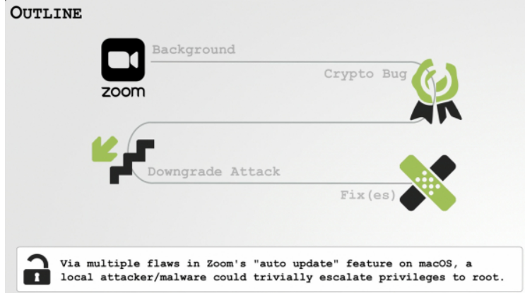 패트릭 워들이 데프콘에서 설명한 맥OS용 줌 설치 파일의 자동 업데이트 기능 취약점을 이용한 권한 상승 익스플로잇(출처: ARS Technica)