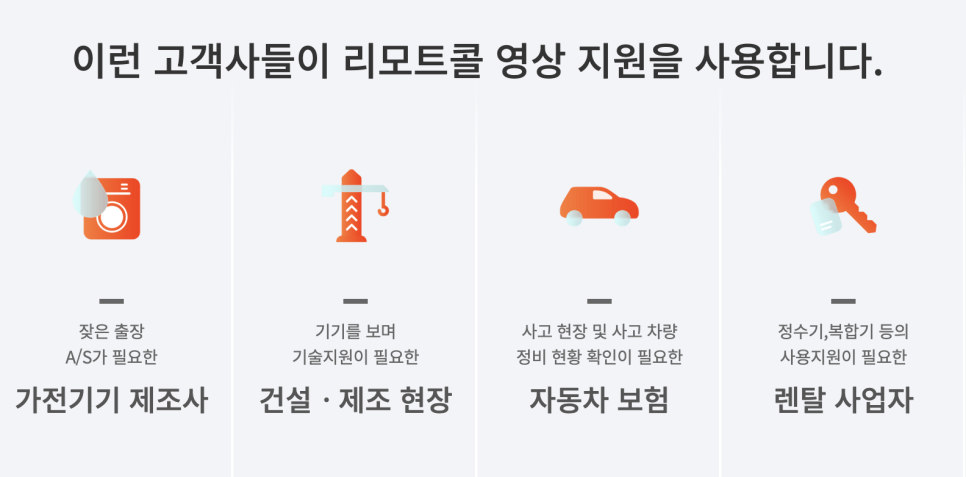 영상 지원이 중요한 이유는 명확합니다. 현장 방문에 소요되는 시간과 비용을 대폭 절감할 수 있기 때문입니다. 고객은 상담사가 보낸 링크를 클릭하는 것만으로 즉시 현장 상황을 영상으로 공유할 수 있으며, 상담사는 이를 실시간으로 확인하면서 문제를 해결할 수 있습니다. 이는 고객과의 연결이 더욱 빠르고 쉬워지며, 복잡한 설치 과정 없이 즉시 원격 지원이 가능합니다.
