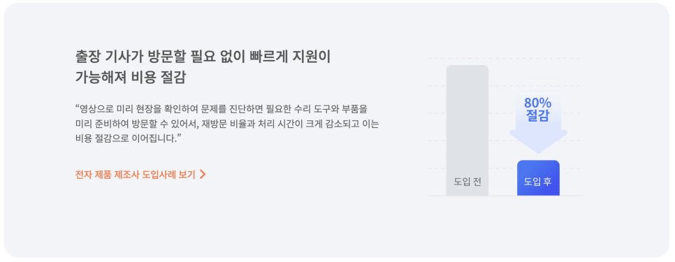 2. 해결 시간 개선 및 비용 절감: 출장 기사의 방문 없이도 빠르게 문제를 해결할 수 있어, 시간과 비용을 절감할 수 있습니다. 미리 현장을 영상으로 확인하고 문제를 진단하여, 필요한 도구와 부품을 준비한 후 방문할 수 있어 재방문 비율과 처리 시간을 줄일 수 있습니다.