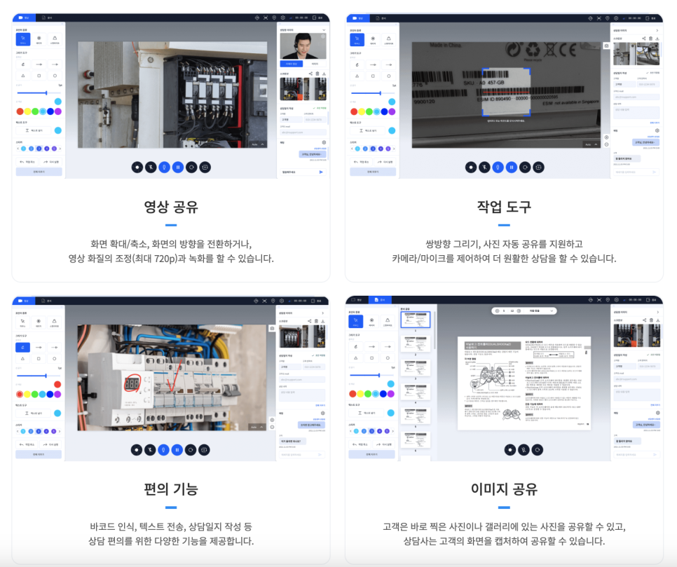 3. 다양한 기능 탑재: ▲양방향 그리기 ▲문서·이미지 공유 ▲영상 공유 ▲세션 공유·전달 ▲바코드·QR코드 인식 ▲GPS 위치 전송 등 고객지원에 필요한 다양한 기능을 제공해 문제를 쉽게 해결할 수 있습니다.