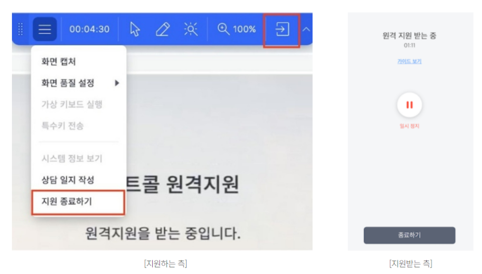 또는 지원받는 쪽에 초기 공유 화면 내 ‘종료하기' 버튼을