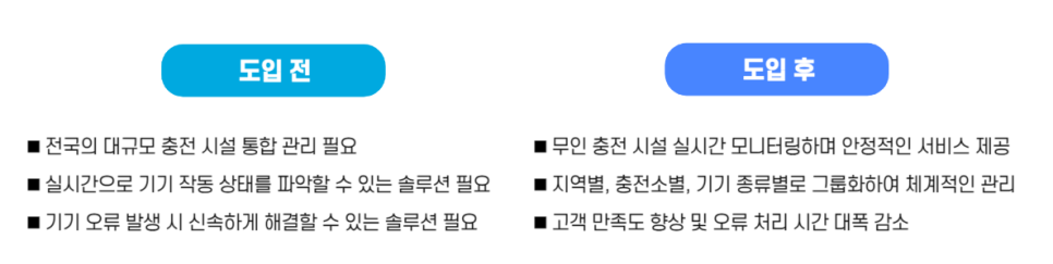 리모트뷰 도입 전 펌프킨은 외산 원격제어 솔루션으로 충전 시설을 관리하고 있었으나, 대규모 충전기를 통합적으로 관리하는 기능과 고객 의견 반영이 부족하여 현재는 리모트뷰를 도입하여 사용하고 있습니다. 무인 시설 통합 관리에 최적화되어 있는 리모트뷰 도입 후, 전국의 수많은 충전기를 지역별, 충전소별, 기기 종류별로 그룹화하여 체계적으로 관리하고 있습니다.