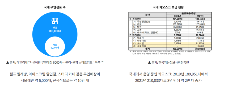 코로나 이후 재택근무, 원격근무, 원격협업 등 비대면으로 업무하는 제도를 채택하는 곳이 증가하면서 일하는 방식에 많은 변화가 있었습니다. 비대면(언택트) 방식의 소비 수요가 급증하면서 음식점 또는 카페 내의 키오스크, 무인 주차 시스템, 무인 사진관 내 인화기, 셀프 주유기 무인결제 등 일상에서 무인점포와 무인기기를 만나고 이용하는 일이 자연스러워졌죠?