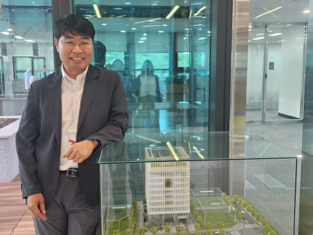 "2019년 7월 용지매매 계약을 체결하고 근 5년만에 완공했다. 100년 가는 튼튼한 건물은 기본이고, 오피스는 오피스다워야 한다고 생각했다. 우리 건물을 보면 딱 오피스 건물 같지 않나(웃음). 요즘 지어진 오피스텔들은 오피스같지 않아 싫었다. 제대로 된 오피스는 생산성을 높일 수 있어야 한다. 우리 신축 건물은 1층 로비부터 다르다. 인류 삶을 바꾼 모든 기술은 호기심과 상상력에서 시작했다. 1층 로비를 비롯해 직원들 호기심과 상상력을 자극하도록 설계했다."
