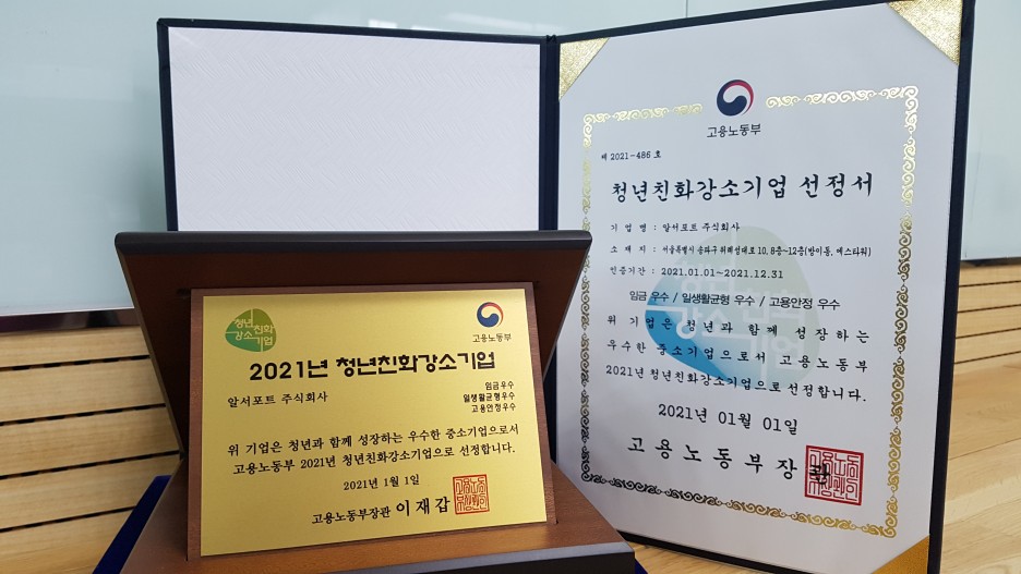 고용노동부는 2016년부터 매년 심사를 통해 임금, 일생활균형, 고용안정, 청년고용실적 등이 우수한 중소기업을 ‘청년친화 강소기업’으로 선정하고 있습니다. 저희 알서포트는 2016년 1호로 청년친화 강소기업에 선정된 이후 매년, 한 번도 빠짐없이 선정되고 있는데요, 특히 올해는 ▲임금 ▲일생활균형 ▲고용안정 등 3개 분야에서 ‘우수’ 평가를 받았답니다.