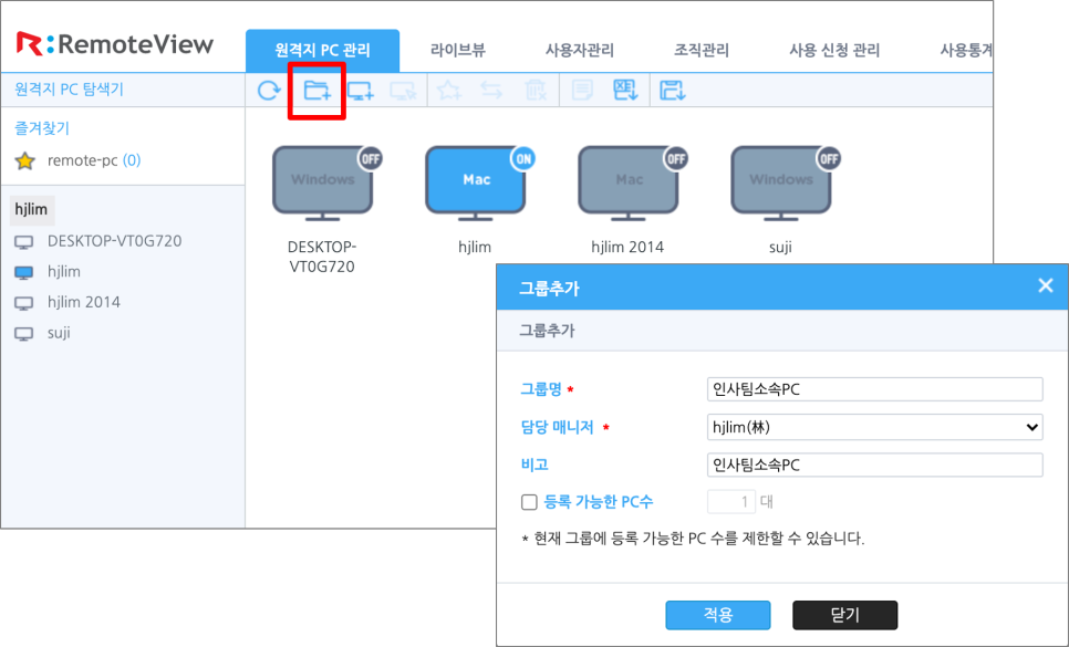 1. 원격지 PC 관리 탭 > 그룹 추가 아이콘 클릭