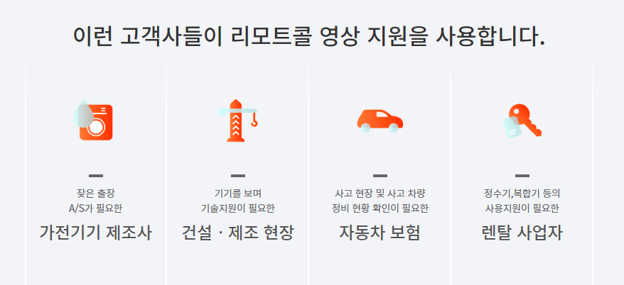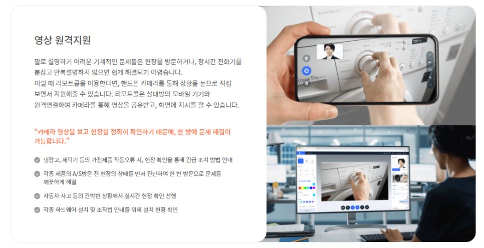 이러한 상황에서 원격지원 리모트콜(RemoteCall)와 같은 원격관리 솔루션이 장기적으로 큰 도움이 될 수 있는데요. 제품의 동작이나 기능에 대한 설명을 해야 한다면 말로 하나하나 설명해주는 것은 쉬운 일이 아닙니다. 고도화된 전자기기일수록 더욱 어렵습니다. 고객이 서비스센터에 방문하거나 출장기사가 방문해서 알려주면 정확한 안내는 가능하지만 시간과 비용이 들어갑니다. 이럴 때 리모트콜의 영상 지원을 사용한다면, 옆에서 같이 보는 것처럼 편리하게 고객에게 안내를 해줄 수 있고, 경제적 시간적 부담도 최소화하며 빠르게 문제를 해결할 수 있습니다.