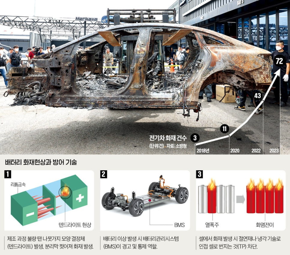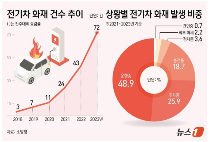 소방청에 따르면 전기차 화재는 2021년 24건에서 2022년 43건, 지난해 72건으로 매년 급증하는 추세다.