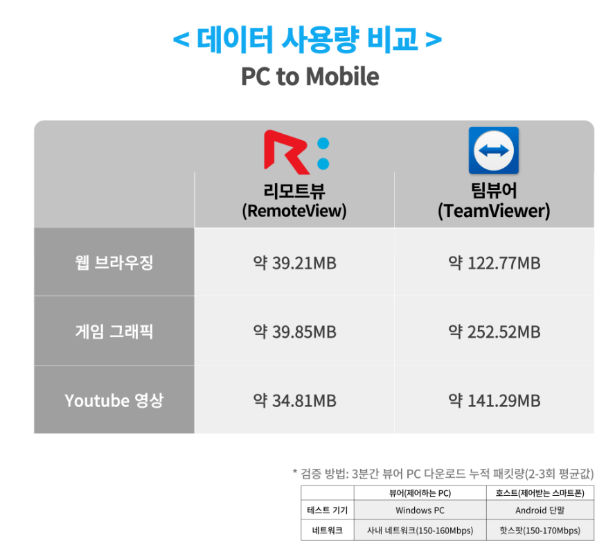 리모트뷰와 팀뷰어의 데이터 사용량을 비교해보았습니다.👇👇
