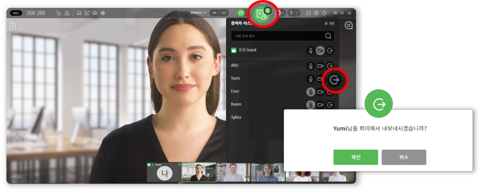 참여자 리스트를 보고 참석자들이 다 모였는지 확인해 보세요. 사회자 모드가 켜져 있는 상태에서 참여자 리스트를 열어보면 특정 참여자를 내보낼 수 있는 ‘강제 퇴장’ 아이콘이 표시됩니다. 관계자외 제3자가 들어와 있다면 여기서 내보내세요.