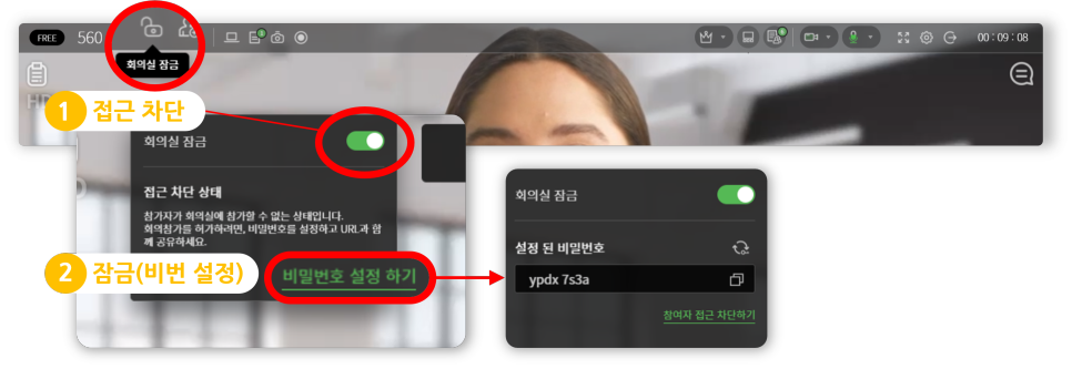 정해진 참가자만 들어올 수 있는 보안이 유지된 회의실을 만들어야 한다면 미리 회의실 잠금 설정을 확인해 보는 것이 좋아요! 모든 참가자가 들어오고 난 다음에 아무도 못 들어오게 하는 접근 차단 방식 또는 모든 참가자들이 입장 시 비밀번호 입력을 거쳐야 들어올 수 있는 잠금 방식 두 가지가 있음을 확인할 수 있습니다.