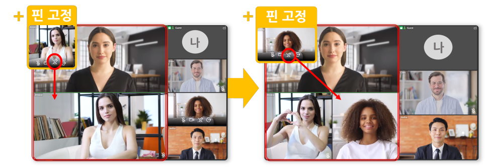 강조 모드에서 핀 고정 아이콘을 클릭하면 원하는 사람을 더 큰 영역에 고정시킬 수 있어요.