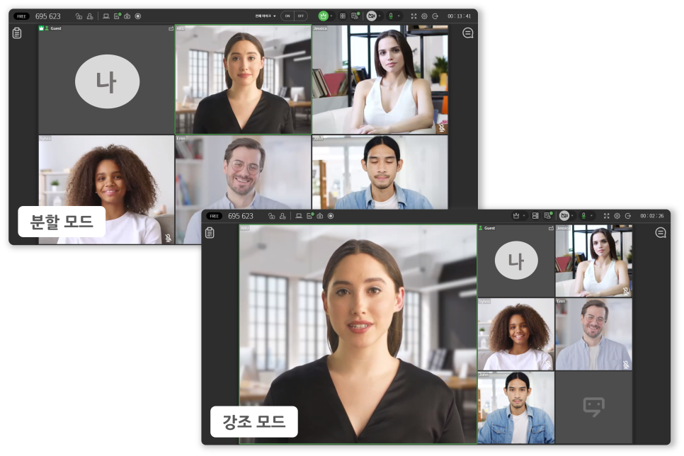 리모트미팅에서 제공하는 3가지 화면 모드를 먼저 확인해 보세요. 회의 유형에 맞는 화면 모드를 고르시면 되는데요. 참여자들에게 어떤 화면 구성으로 보여줄지? 발표자나 중요 인물 등 누가 어느 영역에 들어가면 더 좋을지? 미리 생각해 놓으면 당일 진행이 훨씬 더 수월해집니다.