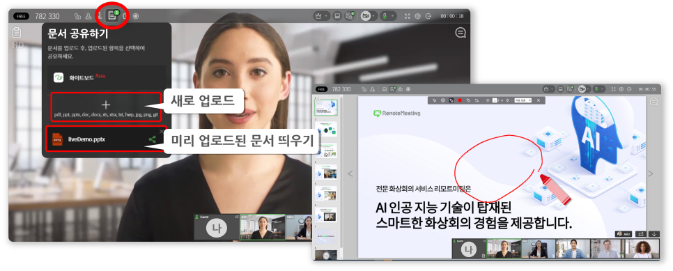 회의에 빠질 수 없는 게 발표 자료나 브라우저 창과 같은 특정인의 PC 화면을 그대로 모든 참여자들에게 보여주는 것. 사전에 받은 자료가 있을 경우 미리 올려 놓으면 더 수월한 진행이 가능합니다.