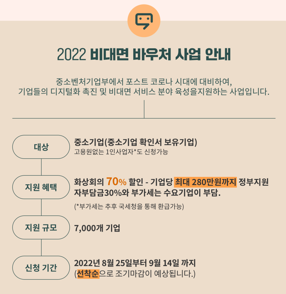 비대면 바우처는 중소벤처기업부에서 포스트 코로나 시대에 대비하여 기업들의 디지털화 촉진과 비대면 서비스 분야 육성을 지원하는 사업입니다. 기업이 비용 부담 없이 비대면 업무 환경을 구축할 수 있도록 최대 280만 원까지(자부담 30% 포함) 비용의 70%를 지원받을 수 있고, 8월 25일부터 9월 14일까지 전국 중소기업 7,000개 기업을 추가로 모집한다고 합니다.