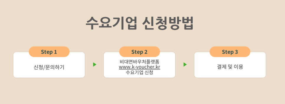 수요기업에 해당되는지 살펴본 후, 비대면 바우처 플랫폼(www.k-voucher.kr)에서 온라인 신청을 합니다. 최종 선정이 되고 바우처를 지급받으면 플랫폼에 등록된 서비스 상품을 선택 후, 결제‧이용하면 됩니다.