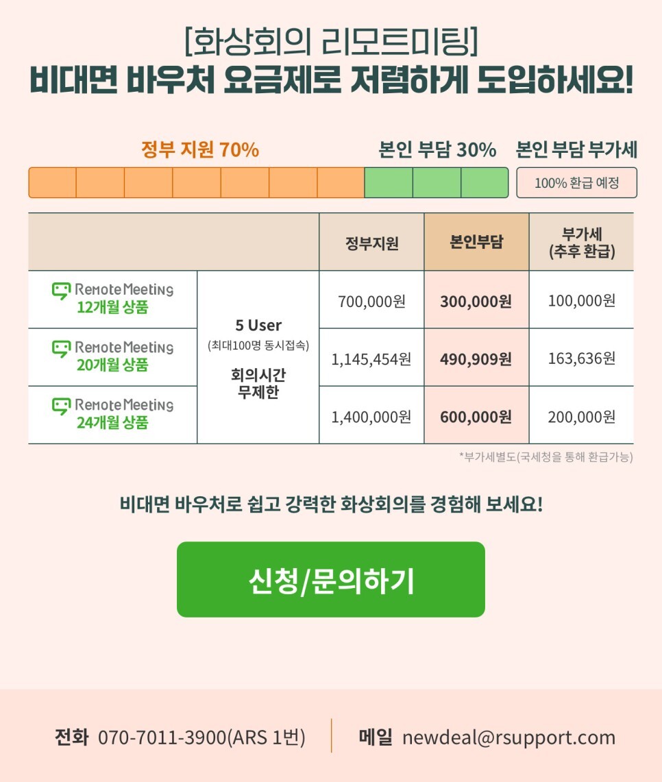 비대면 바우처는 중소벤처기업부에서 포스트 코로나 시대에 대비하여 기업들의 디지털화 촉진과 비대면 서비스 분야 육성을 지원하는 사업입니다. 기업이 비용 부담 없이 비대면 업무 환경을 구축할 수 있도록 최대 280만 원까지(자부담 30% 포함) 비용의 70%를 지원받을 수 있고, 8월 25일부터 9월 14일까지 전국 중소기업 7,000개 기업을 추가로 모집한다고 합니다.