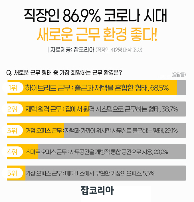 - 가장 희망하는 근무 환경으로 68.5%의 이들이 ‘하이브리드 근무’를 꼽았다.