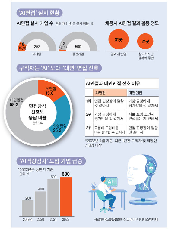 기업들이 채용 전형에 AI면접과 AI역량검사를 앞다퉈 도입하고 있습니다. AI역량검사 솔루션 업체인 마이다스아이티에 따르면 AI역량검사를 도입한 기업은 총 630곳에 이르며 2019년(260곳) 대비 2배 이상 증가한 수치라고 합니다. 지금은 더 많이 늘어났겠죠?