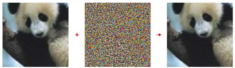 [이미지2]는 AI의 한계를 보여주는 두 번째 사례다. 왼쪽에는 판다(panda)를 찍은 사진의 원본 이미지고, 가운데는 일종의 잡음(noise) 이미지이다. 원본 판다 이미지와 잡음 이미지를 혼합한 합성한 결과가 오른쪽에 있는 이미지인데, 사람의 눈으로는 아무리 살펴 보아도 원본 이미지와 합성 이미지를 구분할 수 없다. 그런데 AI, 구체적으로 딥러닝 모델이 왼쪽 사진을 판다 라고 정확히 인식한 반면, 오른쪽의 이미지를 긴팔원숭이(gibbon)이라고 잘못 판단을 하는 경우가 있었다.