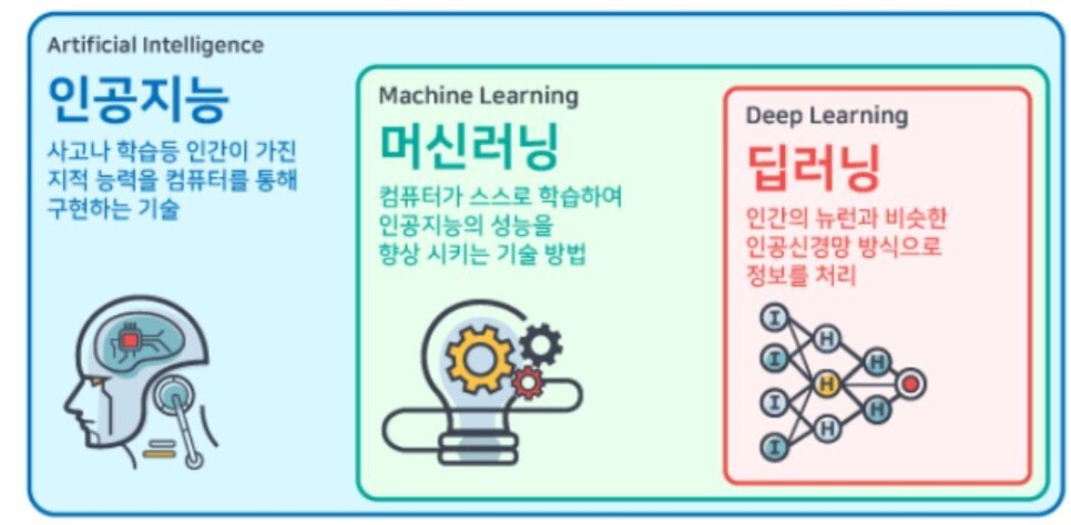 이에 대한 엄밀한 정의 대신 이 글에서는 ‘기존의 데이터에서 패턴을 찾아낸 후 새로운 데이터가 암시하는 바를 예측하는 컴퓨터 기술’ 정도로 정의해도 무방하겠다. 일반적으로 기대하는 정의와 사뭇 달라서 실망스러울 수도 있겠지만 아직까지 AI는 이 정도 수준이다. 또한, 아래 [이미지1]와 같이 인공지능의 범주 안에서 패턴을 찾거나 예측하는 과정에서 인공신경망을 사용하면 딥러닝(deep learning), 인공신경망 외의 기법을 사용하면 머신러닝(machine learning)이라고 표현하면 큰 무리가 없을 것 같다.