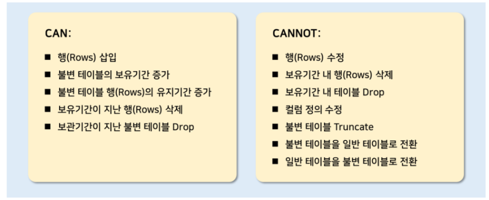 [그림 1]와 같이 불변 테이블은 새 데이터를 추가할 수는 있지만 데이터베이스를 사용하는 어느 누구도 기존 데이터에 대한 변경이나 삭제가 불가하다. 이는 데이터베이스 관리자(DBA)도 변경•삭제가 불가하여, 데이터베이스(SQL)를 사용하는 내부자에 의한 불법 수정도 원천 방지할 수 있다.