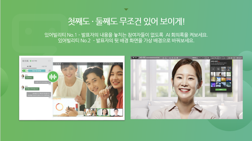 일곱 번째는, 바로 있어빌리티입니다. 온라인에서 진행되는 발표는 첫째도 둘째도 무조건 있어 보여야 합니다. 예를 들어 발표 도중에 발표자의 음성이 TEXT로 자동 변환되어 보여지는 걸 한번 보여준다거나 또는 발표자의 뒷 배경을 가상 배경으로 변환해서 보여주는 거예요. 단조로운 화면을 계속 보여주는 것보다 "어? 이게 뭐지??" "신기하네" 라는 반응이 나올 수 있도록 화면을 계속 변신시켜서 보여주는 거죠.