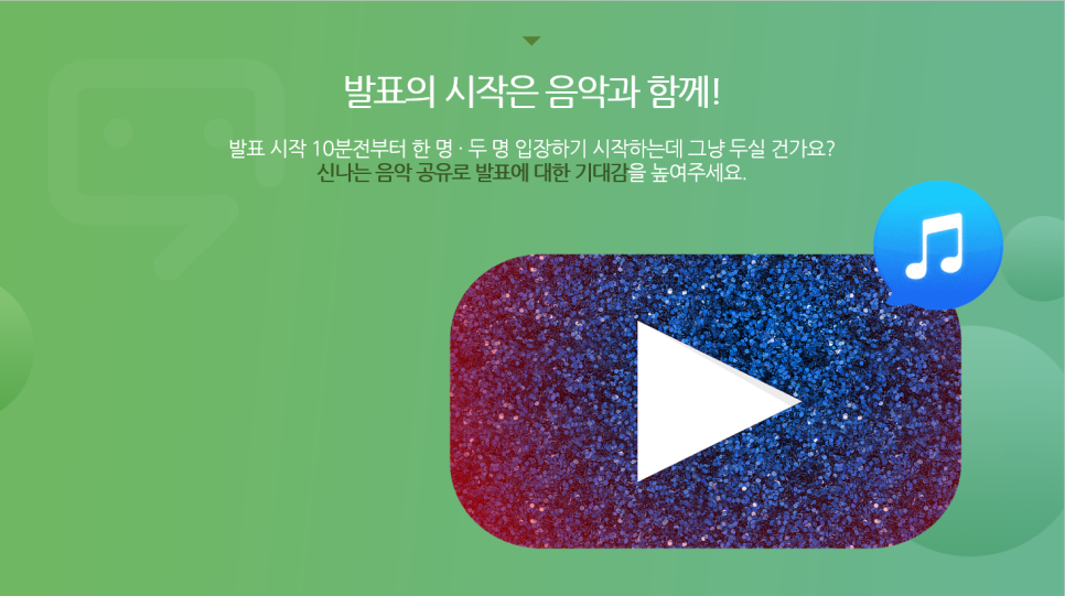 첫 번째! 발표의 시작은 경쾌한 음악과 함께 하셔야 합니다. 만일 MP4 파일과 발표 시작을 알리는 인트로 페이지를 따로 준비하지 못하셨다면, 유튜브에서 뮤직 비디오라도 플레이해주세요. 발표 시작 몇 분 전부터 한 명, 두 명 계속 입장하는데 그냥 방치해 두시는 것보다는 신나는 음악을 틀어주어 발표에 대한 기대감을 높이는 게 좋습니다.