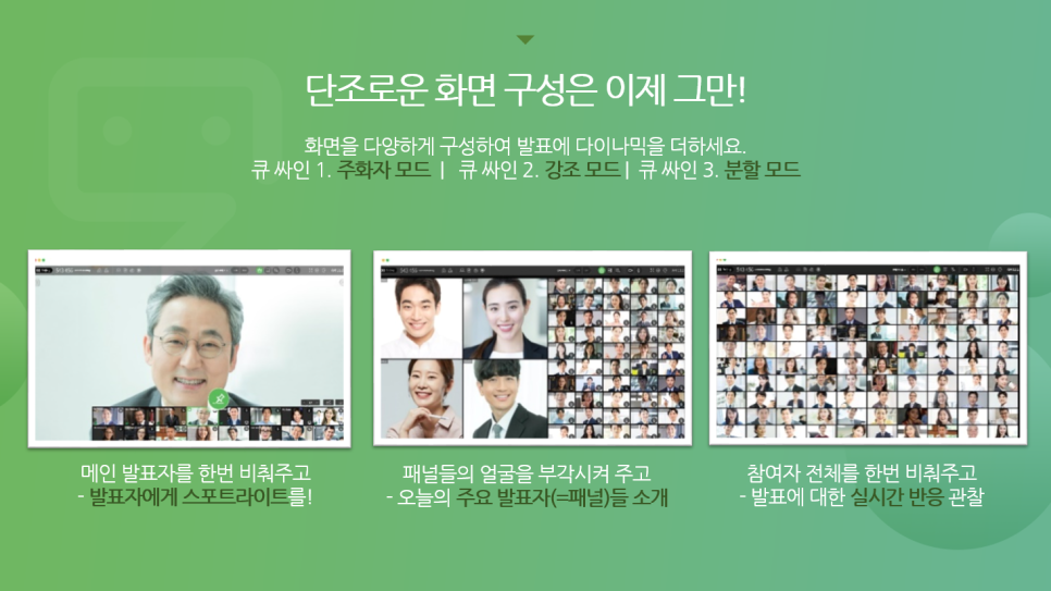 네 번째는 다양하게 화면을 구성하는입니다. 리모트미팅은 총 3가지의 화면 모드(주화자/강조/분할 모드)를 제공하고 있으며, 오른쪽 상단 메뉴의 [화면 모드]에서 원하는 모드를 선택할 수 있는데요, 이걸 활용해서 스스로에게 일종의 큐 사인을 줘서 생방송처럼 꾸미는 방법이 있답니다! 주화자 모드로 발표자에게 스포트라이트를 한번 주고, 강조 모드로 패널들의 얼굴을 한 번씩 부각시켜 주고, 분할 모드참여자 전체 모습을 한번 비춰줘서 발표에 대한 참여자들의 실시간 Live 반응을 보여주는 식으로요. PD가 생방송을 지휘할 때 보면 [카메라 1/2/3]로 앵글 및 역할을 구분하고 화면을 스위치 하는 것처럼, 리모트미팅에서는 노트북에 내장된 카메라 1대로 화면을 3 타입으로 전환시켜 보여주는 겁니다. 카메라를 몇 대씩 두고 세팅할 필요 없이 리모트미팅에 접속한 노트북 한대로 발표 중간중간에 화면을 다양하게 구성해서 발표에 생동감을 줄 수 있답니다!